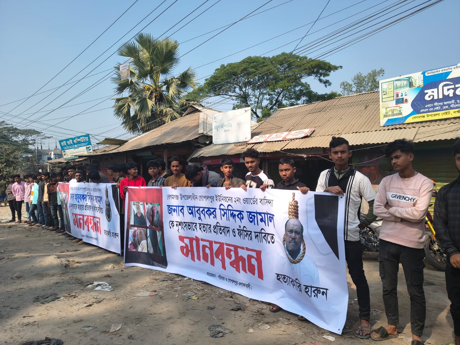 মানববন্ধনে নিহত আবু বকর ছিদ্দিক জামালের বড় ছেলে শিহাব উদ্দিন, মেঝো ছেলে ফয়সাল উদ্দিন, ভাগিনা মোহাম্মদ ইব্রাহিম হোসেন, যুবদল নেতা শাহ আলম ভূঁইয়া সুজন সহ স্থানীয়রা উপস্থিত ছিলেন। তারা হত্যাকারীর দ্রুত বিচার ও ফাঁসির দাবি জানান।