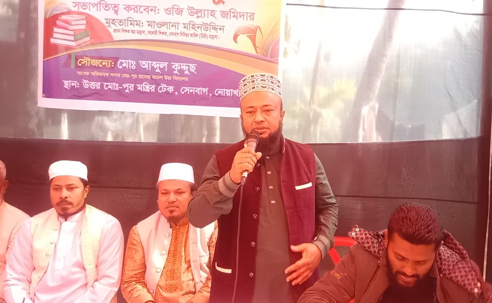 নোয়াখালীর সেনবাগ উপজেলার উত্তর মোহাম্মদপুর হযরত শাহ জালাল (রহ.) খেদমাতুল কোরআন মডেল মাদ্রসার শিক্ষার্থীদের ছবক ও দোয়া মাহফিল অনুষ্ঠিত হয়েছে। মাদ্রাসা প্রাঙ্গনে আয়োজিত অনুষ্ঠানে প্রধান অতিথি ছিলেন রাসনগর ইসলামিয়া দখিল মাদ্রসার সহ-সুপার মাওলানা খুরশিদ আলম। মাদ্রাসা পরিচলানা কমিটির সভাপতি ওজি উল্যাহ জমিদারের সভাপতিত্বে এতে কমিটির সাধারণ সম্পাদক আবদুল কুদ্দুছ, মাদ্রাসার প্রধান শিক্ষক মো: মহিন উদ্দিন, পরিচালক মো: মাইন উদ্দিন, নুল আলম নোভেল, হাফেজ আবদুর রাজ্জাক, উপজেলা ছাত্রদলের ভারপ্রাপ্ত আহবায়ক ফখরুল ইসলাম রুবেল, উপজেলা যুবদলের সাবেক যুগ্ম আহবায়ক রুবেল মির্জা, ইউনিয়ন যুবদলের সাধারণ সম্পাদক আবদুল আলী, যুগ্ম সম্পাদক মো: গোলাপ, প্রচার সম্পাদক মো: সিপনসহ অনেকে বক্তব্য রাখেন।